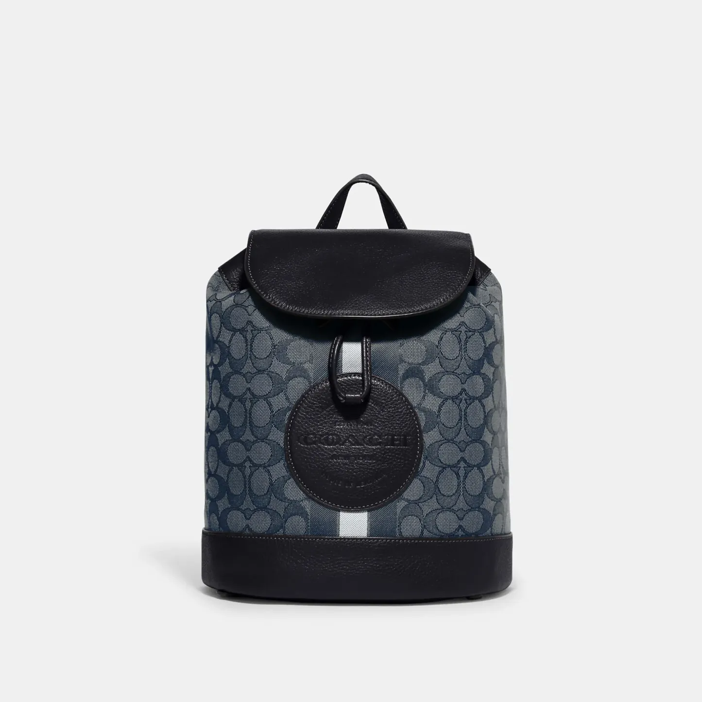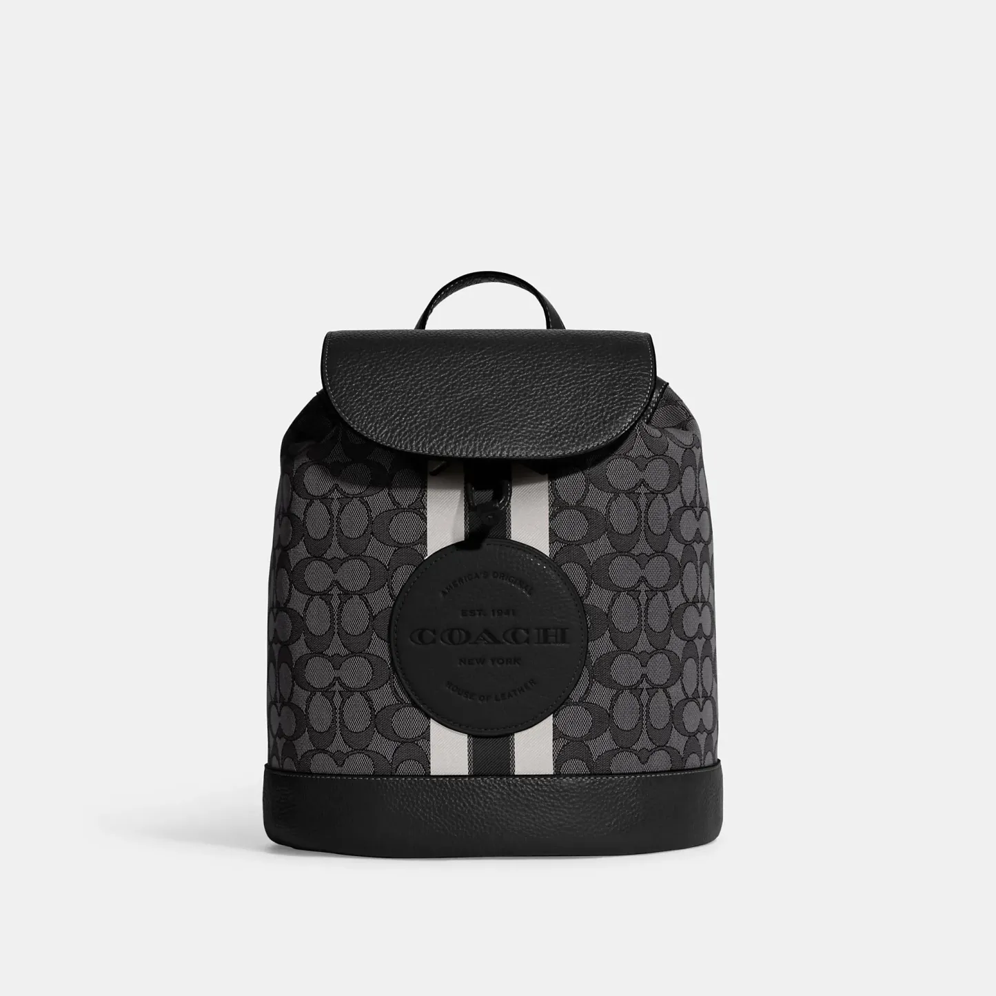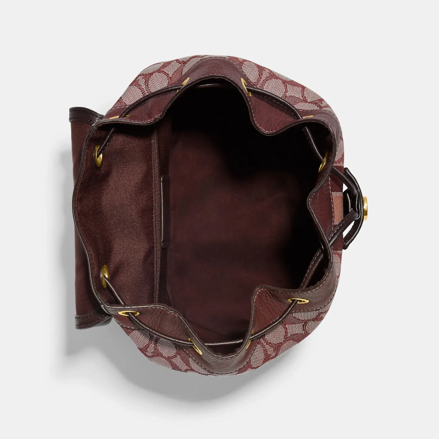 Signature jacquard and refined pebble leather Inside zip and multifunction pockets Drawstring and snap closures fabric lining Top handle with 3 drop Adjustable shoulder straps 10 1/4 (L) x 12 (H) x 6 1/4 (W) This piece is crafted of our Signature jacquard made from a blend of organic cotton and recycled polyester Style No. CE601 | Outlet Dempsey Drawstring Backpack In Signature Jacquard With Stripe And Patch - Red