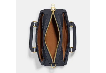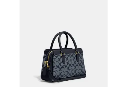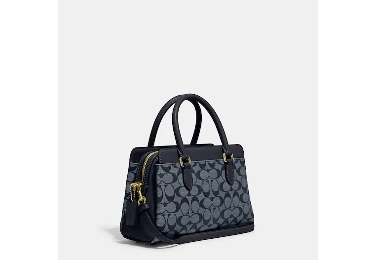 Signature chambray and smooth leather Inside multifunction pocket Zip closure fabric lining Side slip compartments Handles with 4 drop Outside open pockets Detachable strap with 21 1/2 drop for shoulder or crossbody wear Four protective feet at base 10 1/4 (L) x 6 3/4 (H) x 4 1/4 (W) Style No. CH859 | Outlet Mini Darcie Carryall In Signature Chambray - Blue