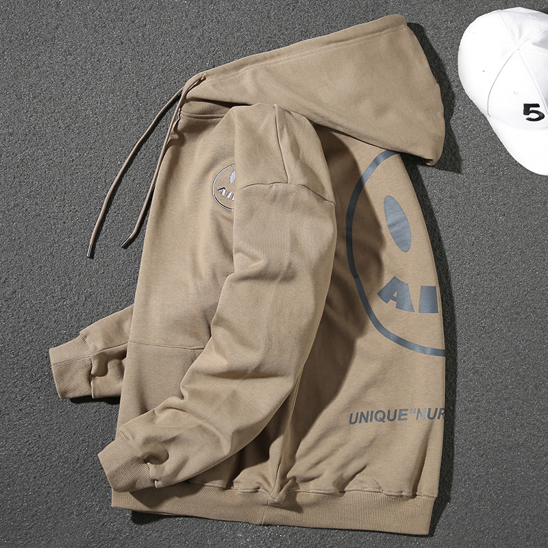 Handsome pure cotton hooded sweatshirt for men, autumn and winter Korean style smiley face letter print loose long-sleeved pullover casual top